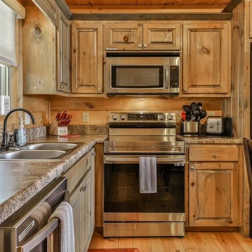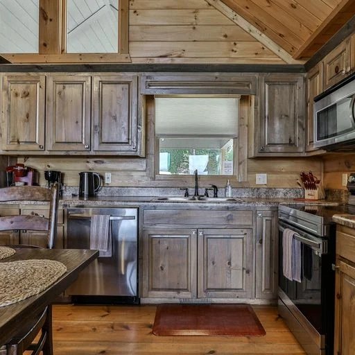 That amazing long-range mountain vista is framed by the enormous windows in the open-plan great room on the main level, where you’ll relax in front of the gas stone fireplace, a flat screen TV above it. It’s one of four in the cabin, all cable-equipped. The adjacent kitchen is a chef’s dream, outfitted with wood cabinets, stainless steel appliances, an electric stove/oven, refrigerator with ice maker, microwave, blender, slow cooker, toaster, mixer, crockpot and drip and Keurig coffee makers. There’s room for seven to eight at the dining table.