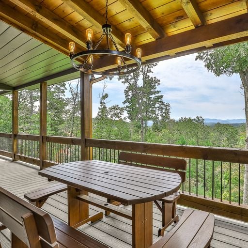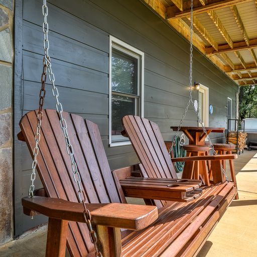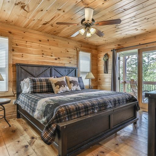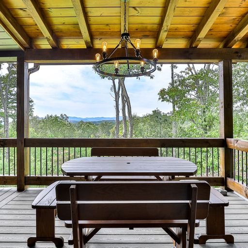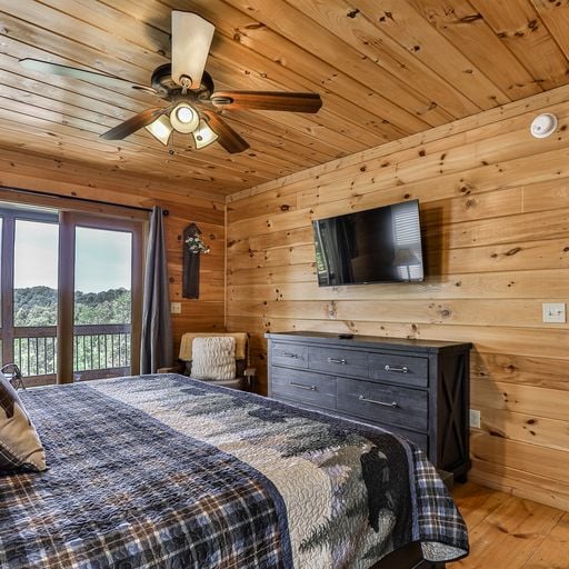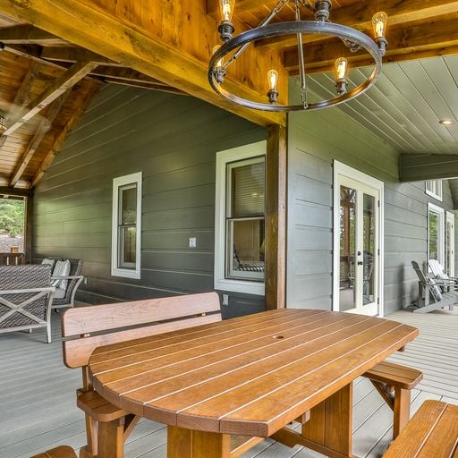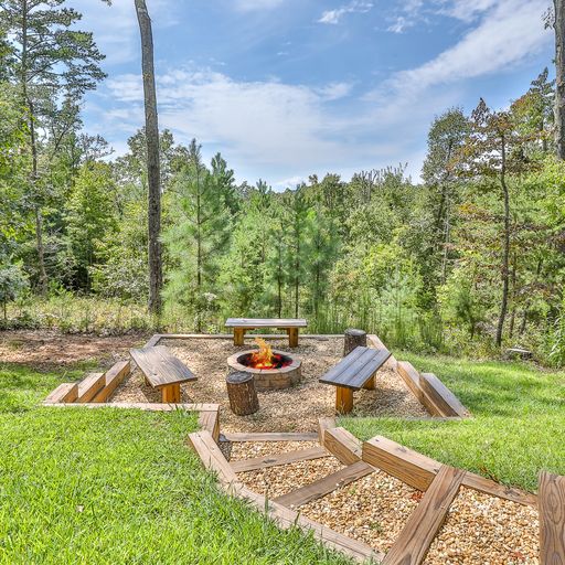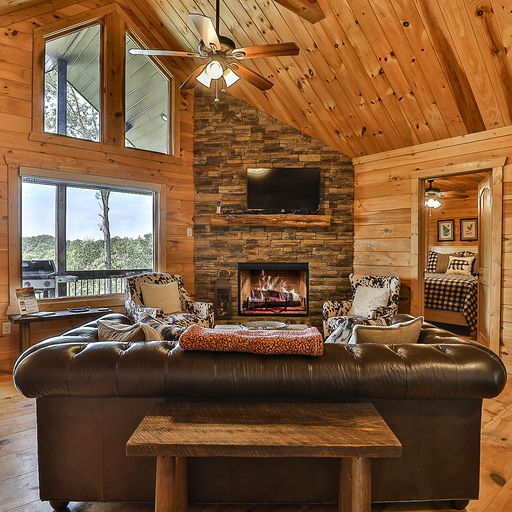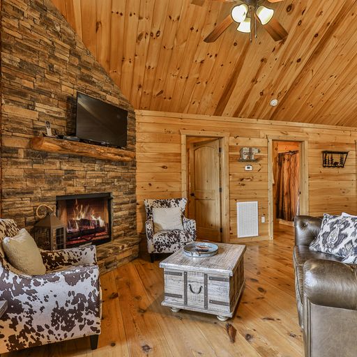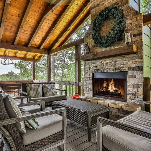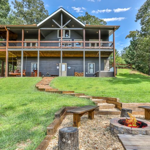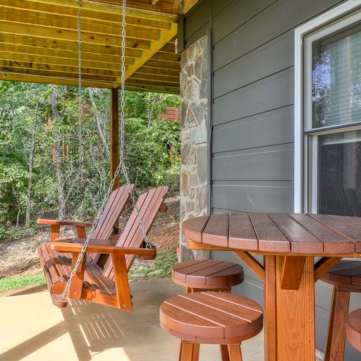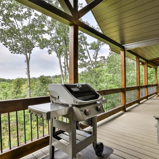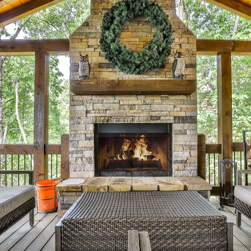 If you’d rather cook and dine outdoors, there’s a gas grill on the main level, with plenty of seating and a wood burning fireplace, and more on the downstairs deck, where a picnic table, porch swing, and a four-seat hot tub await you. Afterward, you can head out to the backyard fire pit with a bag of marshmallows to toast for dessert.