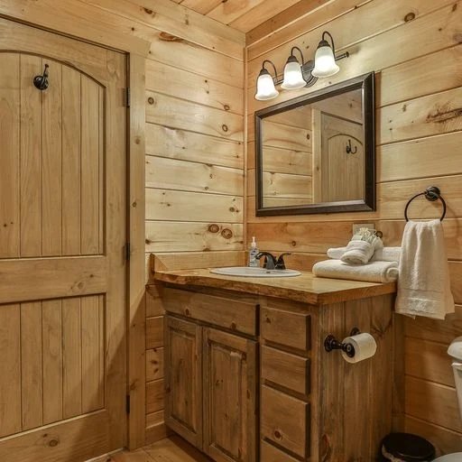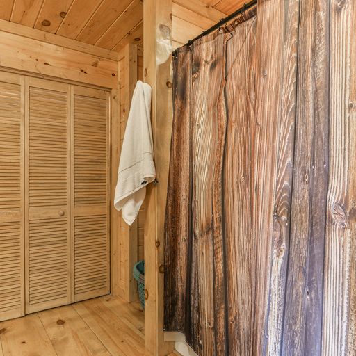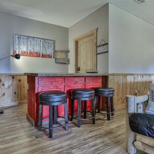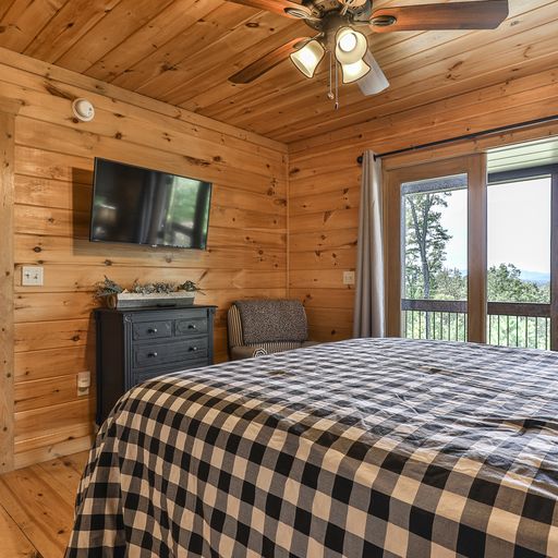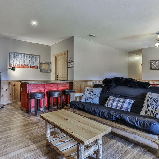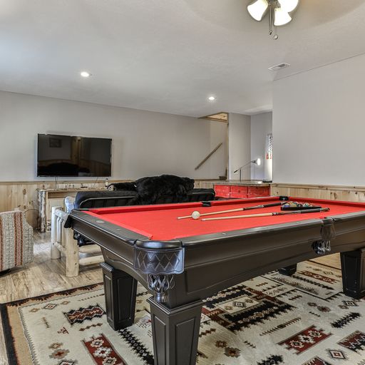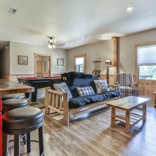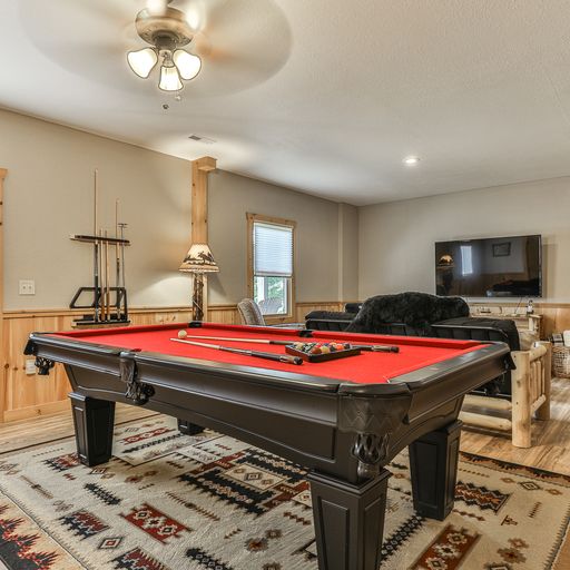 In the lower level game room, you’ll find a billiards table, arcade game system, board games, bar, a 65” flat screen TV and a full-size futon, which brings the cabin’s sleeping accommodations to eight. There’s a bedroom on this floor with a king bed, and a bathroom with tub and shower. One floor above, the master bedroom has a king bed, walk-in closet, and private bath with walk-in tiled shower. The second bedroom on this level has a queen bed and separate bath with tub/shower and a washer/dryer in the closet. Both bedrooms have deck access, TVs, armchairs, dressers, luggage stands, nightstands and lamps.