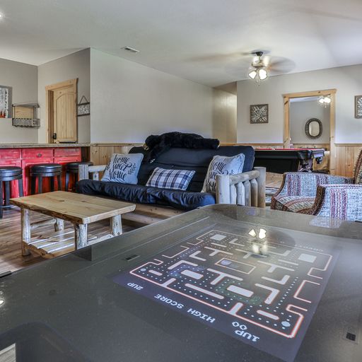 Game Room - billiards, 40” arcade game system, 2 stools, 65” flat screen TV, board games, bar with wine refrigerator and 3 stools, full futon, chair, coffee table, lamp, ceiling fan, deck access